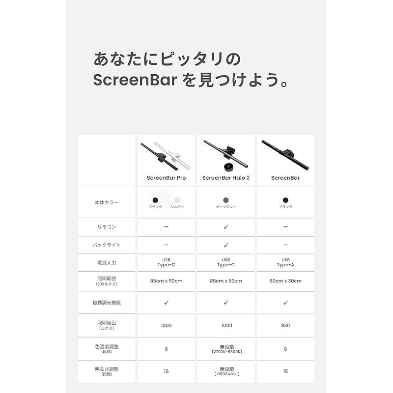 ScreenBar ProはLEDデスクライトを超える初のモニターライトです。中央照度は1000ルクスであり、85*50cmの広範囲で500ルクスの照度を提供し、作業環境を明るく照らします。ASYM-LIGHT非対称光学技術により、画面への映り込みを最小限に抑えれ、PC作業による目の疲れを軽減します。また、ScreenBar Proの特許取得の新クランプは、ウルトラワイドや湾曲モニターまで対応可能です。さらに、超音波検知機能を備えて、自動点灯・消灯できます。USB Type-C電源で、省スペースし、モニター照明として最適です。
