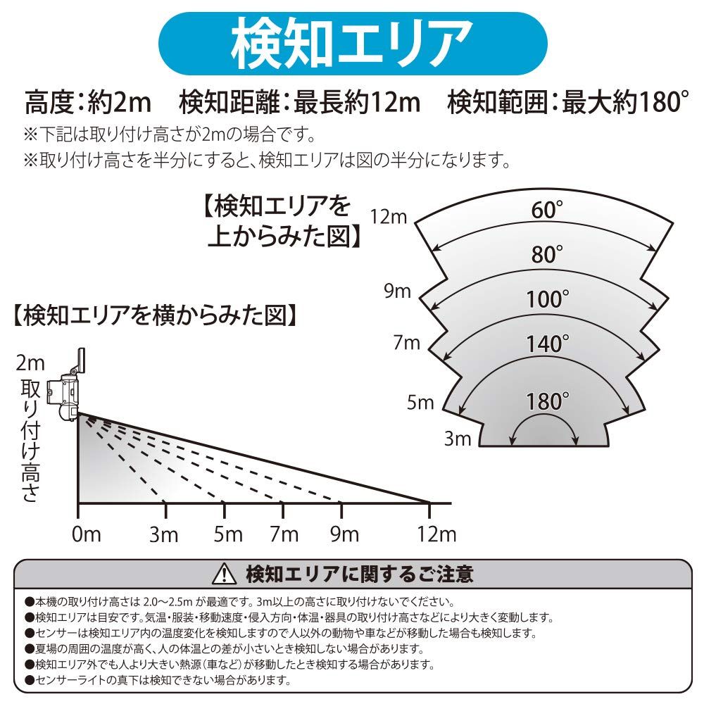 ■ センサー検知範囲:取り付け高さ約2mの場合、最長約12m、最大約180°