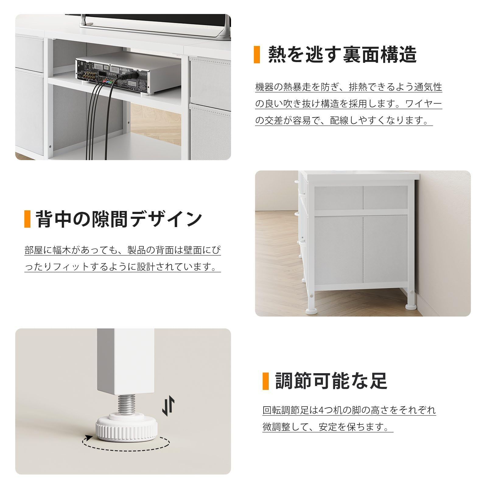 特殊クッション樹脂キャップ付き調整脚が、フローリング・畳へのキズ・へこみを完全防止。傾斜3°までの地面の不平を自動補正し、TVボードのぐらつきゼロを実現。