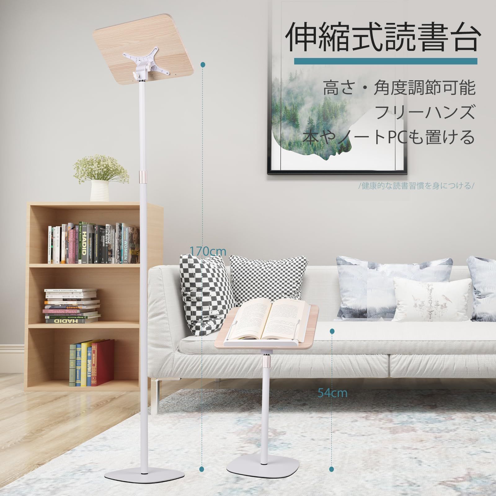 POLESTO 読書用ブックスタンド 54cm-170cm昇降式 サイドテーブル角度調整 金属構造 台座 しっかり安定性 木製パッド付き ノートパソコン、料理本、製図板、譜面台、タブレット用のハンズフリーホルダー(床置き伸縮型 ホワイト)
