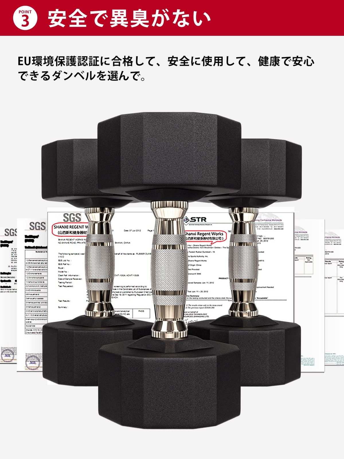 特長PROIRONのダンベルは、独自の摩擦圧接技術により一体成形を実現し、部品が外れることはありません。ゴム製で、強度と環境に優しさを兼ね備え、異臭も発生しません。視認性の高いロゴと重量表示、そしてローリング防止デザインが使いやすさを追求。手に汗をかいても握りやすく、滑らない安全設計。鉛とフタル酸エステルの使用はありません。