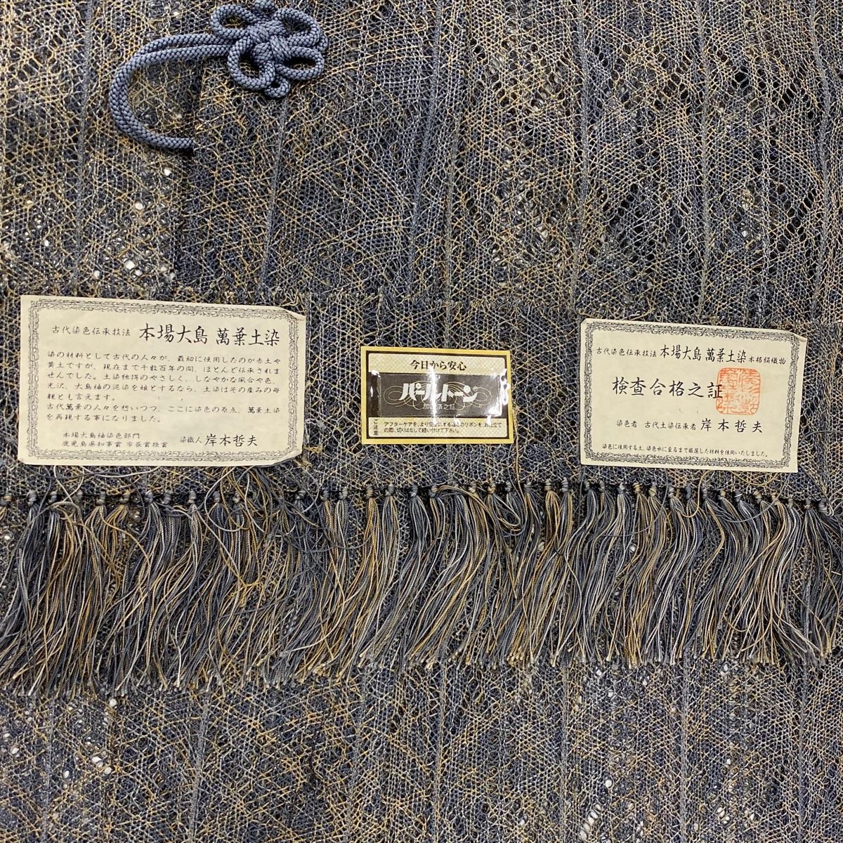 道中着 身丈98.5 cm 裄丈63 S 和装コート 本場大島萬葉土染 落款 証紙 幾何学 縞 青灰色 正絹
