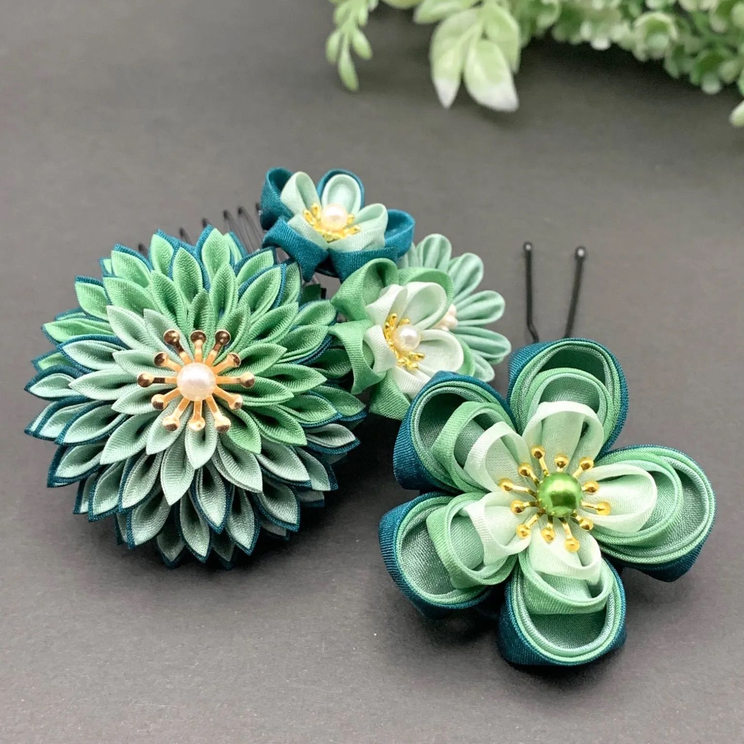 つまみ細工 髪飾り ハンドメイド 成人式 卒業式 結婚式 七五三 振袖 袴 絹 緑色 グリーン 白 オレンジ タッセル 梅 和装 和モダン コーム 髪飾セット
