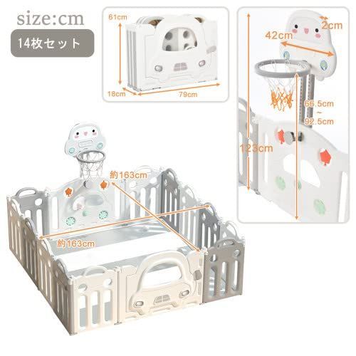 BTM ベビーサークル 折りたたみ 14枚セット 163*163cm 変形可能 扉付き バスケットゴール付き おもちゃパネル ベビーゲート ベビーフェンス プレイヤード 簡単組立 柵 キッズ