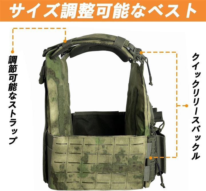 タクティカルベスト サバゲー用 3連 マグポーチ付き 軽量 プレートキャリア レーザー切断 サバイバルベスト MOLLE モール 戦術 クイックリリース バックル サイズ調整可 1000 Dナイロン ミリタリー ATFG迷彩