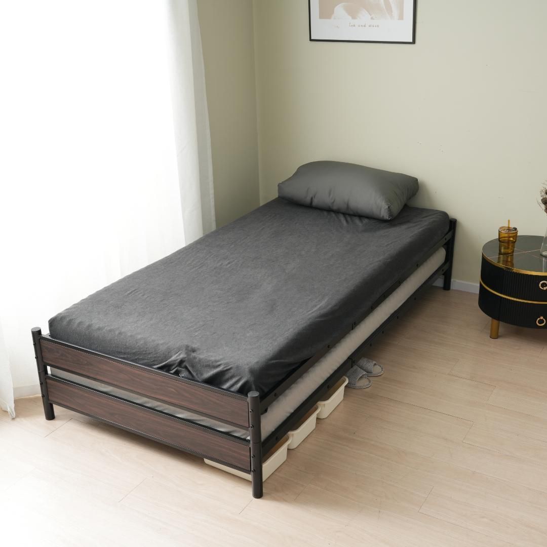 ヘッドボードなしのシンプルなデザインで、自由なコーディネートが楽しめます。普段は2つのベッドを重ねて省スペースなシングルベッド、来客時はスペアベッドに早変わりできます。