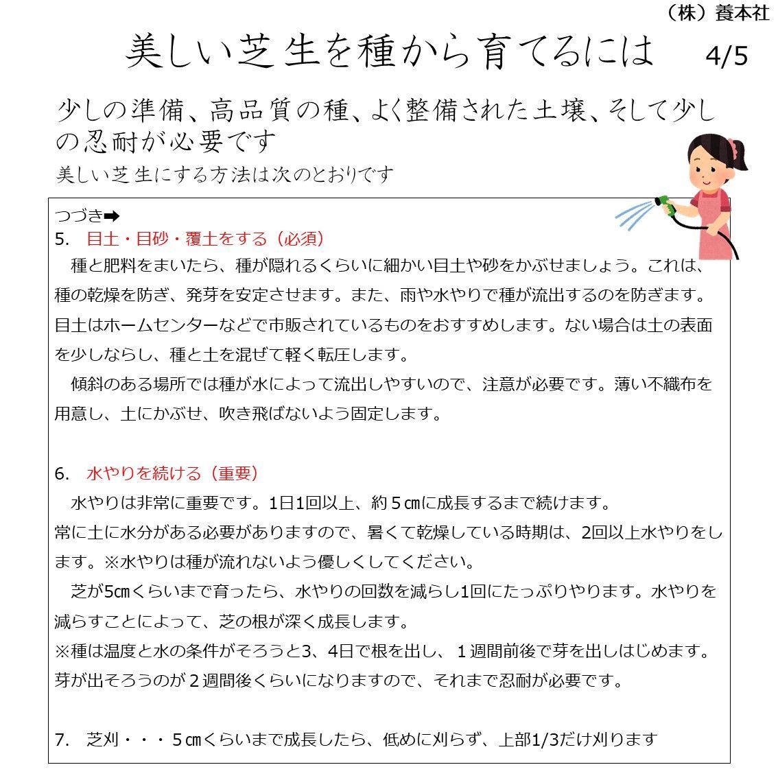 発芽・初期生育が遅いので、芝が密になり定着するまでは除草・芝刈が必要です