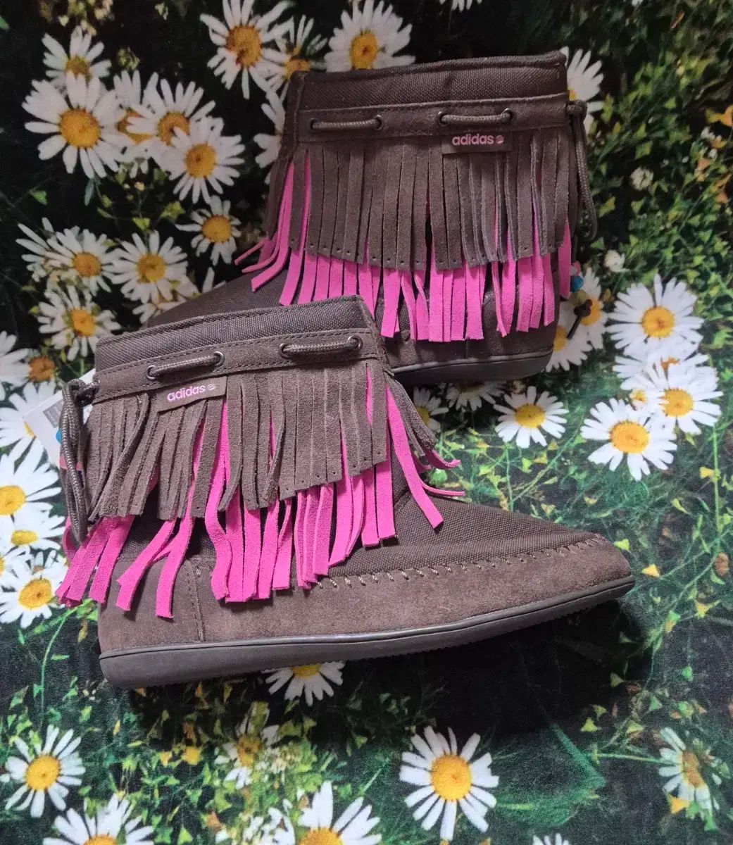 これらは新品の日本製Adidas (アディダス) ブラウンピンクフリンジブーツサイズ225です。このキュートなブーツはブラウンで、ホットピンクのフリンジがアクセントになっています。