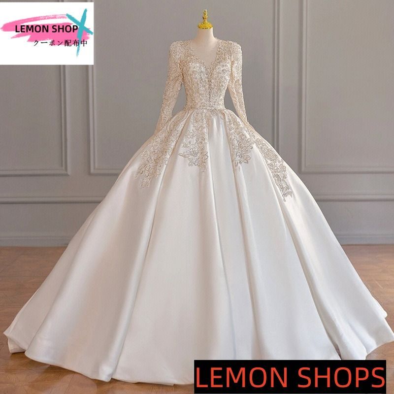 ♥ 2025 ウェディングドレス ロングドレス 結婚式 ウエディングドレス 長袖 Aラインドレス 二次会 花嫁 前撮り エレガント サテン ホワイト ビーズ ラメ刺繍 華やか 披露宴 LEMON