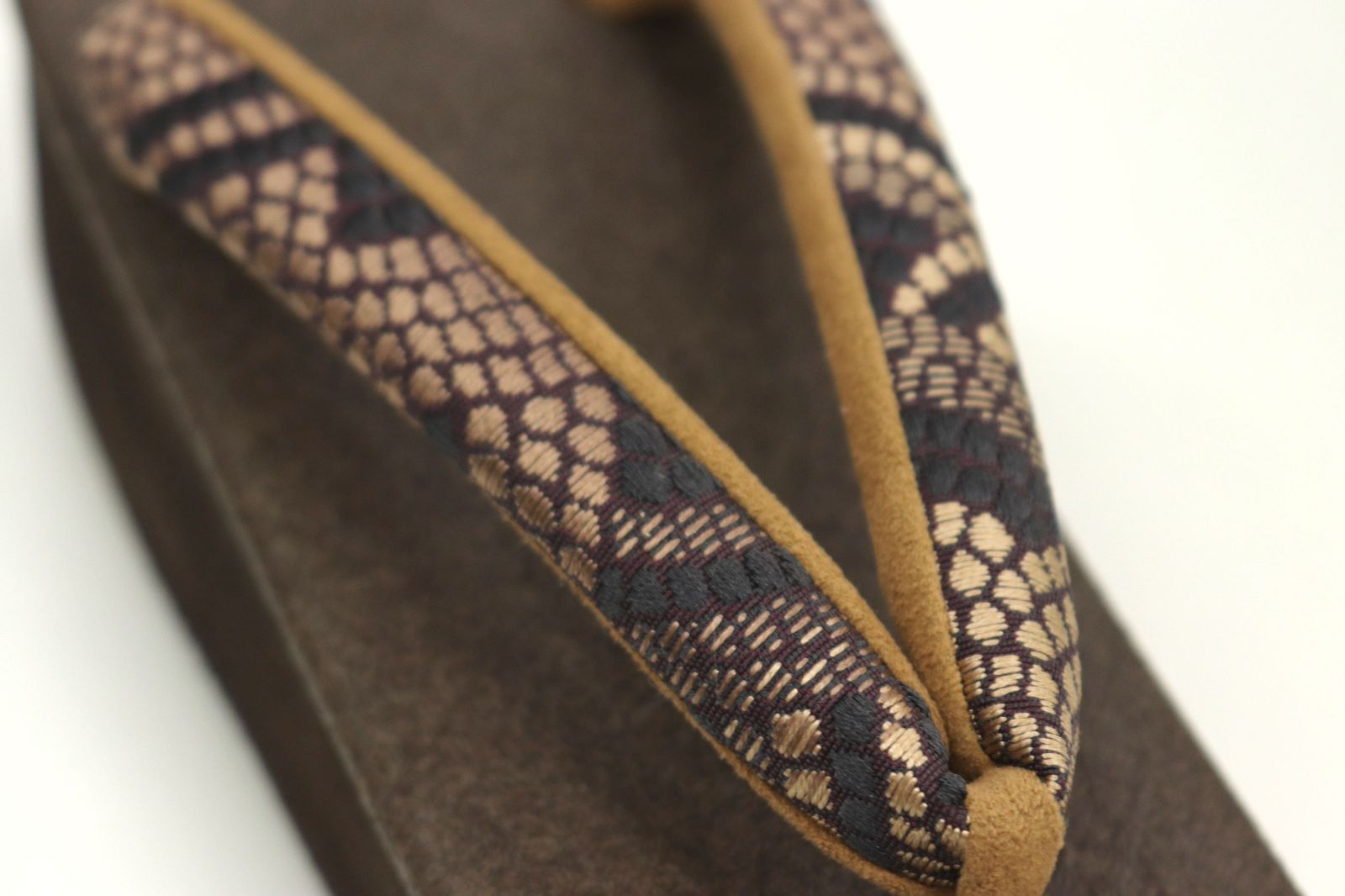 鼻緒には、深紫色、墨色、ブラウンベージュ色のお色目でパイソン柄が織り上げられた博多織の生地が使われており、黄橡色の裏地が付いた鼻緒がすげられております。