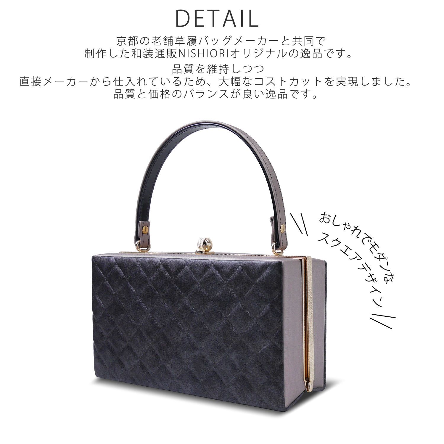 スクエアデザイン×キルト合皮の振袖向き草履バッグ2点セットです。 黒と白のカラーバリエーションはどんな着物にも合わせやすく、