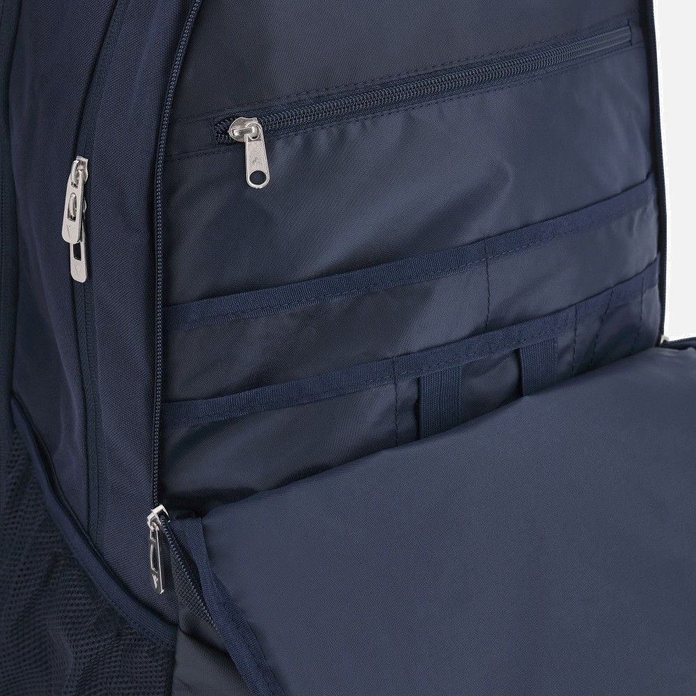 複数のジッパー付きコンパートメントを備えたバックパックです。チームロゴがプリントされています。