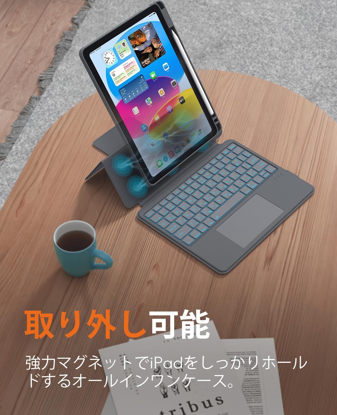 【磁気の取り外し】iPad 10.9インチ(第10世代2022モデル)ケースは、内蔵マグネットによりキーボードの背面にしっかりと吸着され、iPadが使用中にがたつかないように固定されています。iPad 10.9インチ(第10世代2022モデル)ケースは、内蔵マグネットによりキーボードの背面にしっかりと吸着され、iPadが使用中にがたつかないように固定されています。