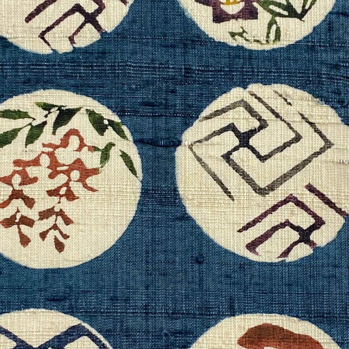 名古屋帯 落款 下平清人 紬地 松葉仕立て 丸文 草花 青灰色 正絹