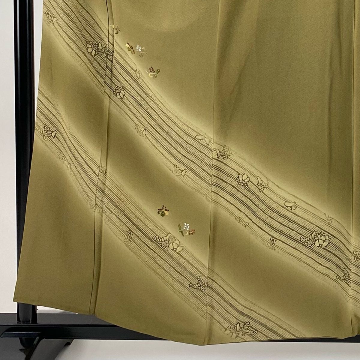 付下げ 身丈158.5 cm 裄丈62.5 S 袷 桐 斜縞 刺繍 金糸 茶緑色 正絹 秀品