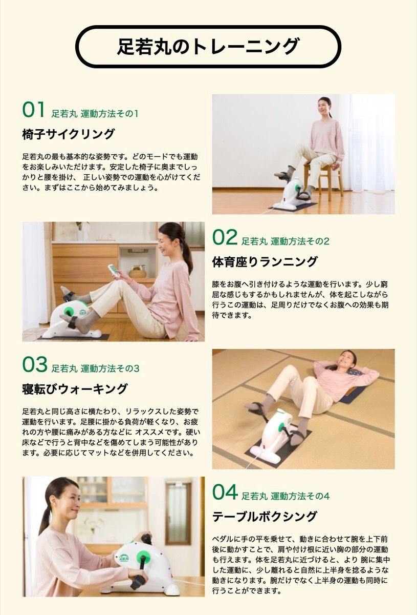 手持ちコントローラーで楽々エクササイズ!軽量、コンパクトで持ち運びも簡単、お部屋で簡単エクササイズ! ●1台4役椅子に座って、寝ながら、電源オフで自力運動、腕の運動●オートオフ機能運動中4秒間回転が強制的に停止されると、自動的に電源が切れる安全装置付き●なぜ足若丸が良いのかスムーズな関節の曲げ伸ばしと地面からの膝への衝撃・負担軽減を意識した質の高い歩行運動と同等の効果が期待できる運動機器です。操作ボタンは全てわかりやすい日本語表示。●無理なく運動ができるペダルをこぐような運動で関節に負荷なく、無理なく運動ができる●上半身の運動も可!腕だけでなく肩を前後に動かすことで上半身全体の運動に●運動を始めるきっかけになる電動アシストだから、ただ手・足を置くだけで勝手に動くから運動に対しての自信がつき運動を始めるきっかけになる。●自らの力で動かすようになる電動アシストでただ乗っけているだけでなくだんだん自分で運動している気分になり、自らの力で動かすようになっていきます。継続することで関節の動きがスムーズになっていきます。