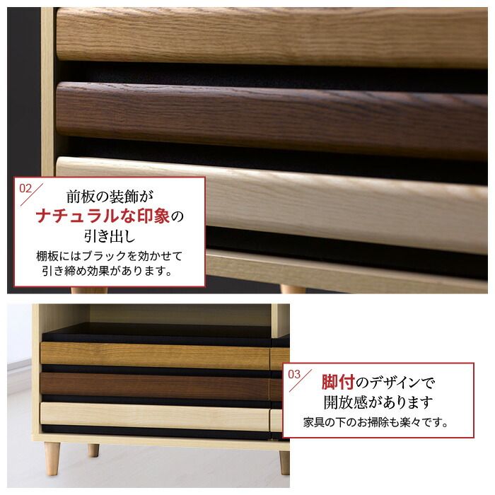 引き出しの3色デザインが目を引くおしゃれなロータイプテレビボード。天然木のような温かみある風合いでリビングに馴染みます。引き出しはスライドレール付きでスムーズに開閉可能。テレビまわりの収納やAV機器の設置に便利です。