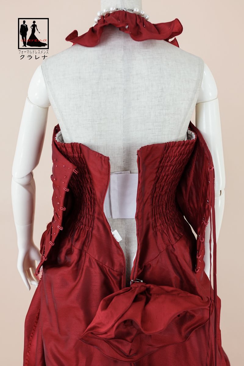 程よい光沢感のあるワインレッド色のポリエステルシャンタン地のカラードレス。