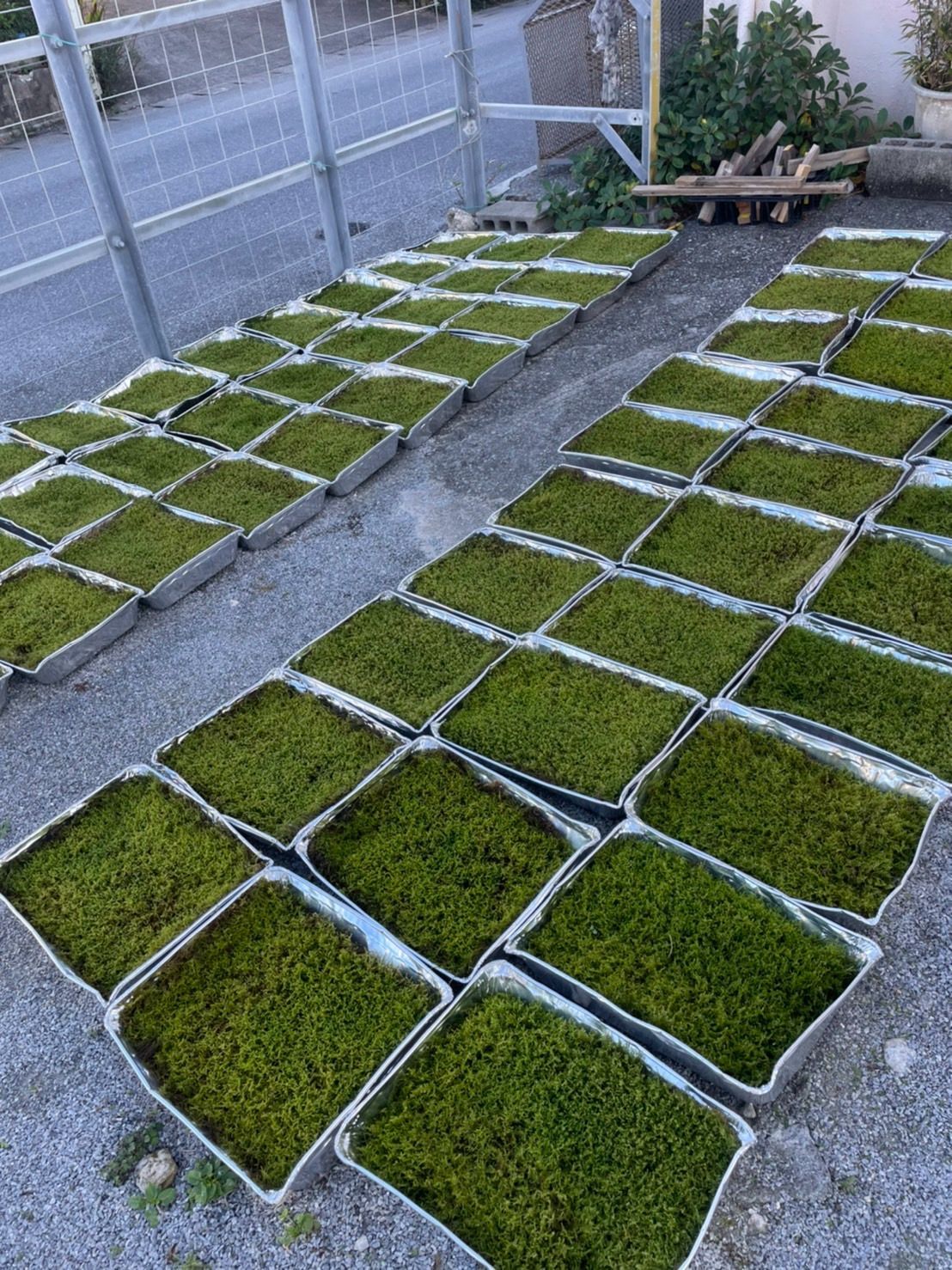 ★海外向けの日本庭園用に育成したハイゴケです。土の代わりに、もみ殻を使用、その上に不織布を敷き育成しています。