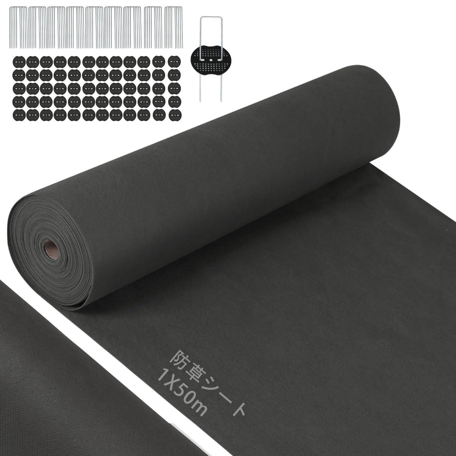 【商品仕様】①防草シートサイズ:1m×50m;カーラー:ブラック;②重さ:約6.5kg;③材質:ポリプロピレンスパンボンド不織布(UV耐侯剤配合);④ 付属品:50本太いスチール製Uピン杭(幅4cm長さ15cm)+50枚黒丸で合計100点セットです。両面使用可能で、複数枚防草シートを合わせてご利用可能、サイズを簡単に調整して、より便利に設置できます。スチール製ピン杭は表面に亜鉛メッキ加工を実施されたなので、腐食や錆びが起こりにくいです。