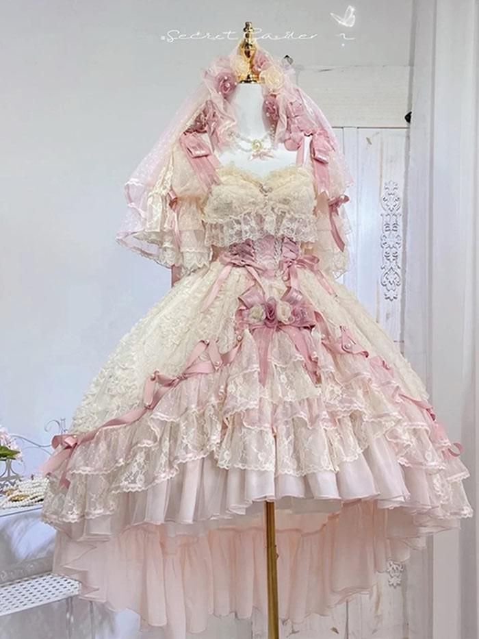 ロリータドレス ロング ワンピース 豪華レース 姫系 Lolita ウェディング風 ロマンチック フォーマル イベント ピンク ブルー コスプレ ロリータ 仮装 コスチューム 衣装 コーディネート パーティ ステージ