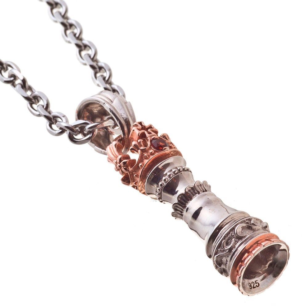 Where poise meets purpose. This sculptural pendant takes the queen from the chessboard and renders her in sterling silver with a refined, architectural profile. Rhodium-finished surfaces play against 18K pink-gold–plated crown and base, creating a poised contrast that flatters the neckline. At the apex, a natural garnet burns quietly—one precise point of red that centers the design. Breathe into the opening at the base and a clear tone sounds, adding a discreet layer of safety for daily life or emergencies. Ornament and instrument in elegant equilibrium. Crafted under the brand’s direction at a partner atelier with true savoir-faire, it stands alone as a statement—or pair it with the King Chess pendant for a story told in two pieces. A small art object made to elevate the everyday.