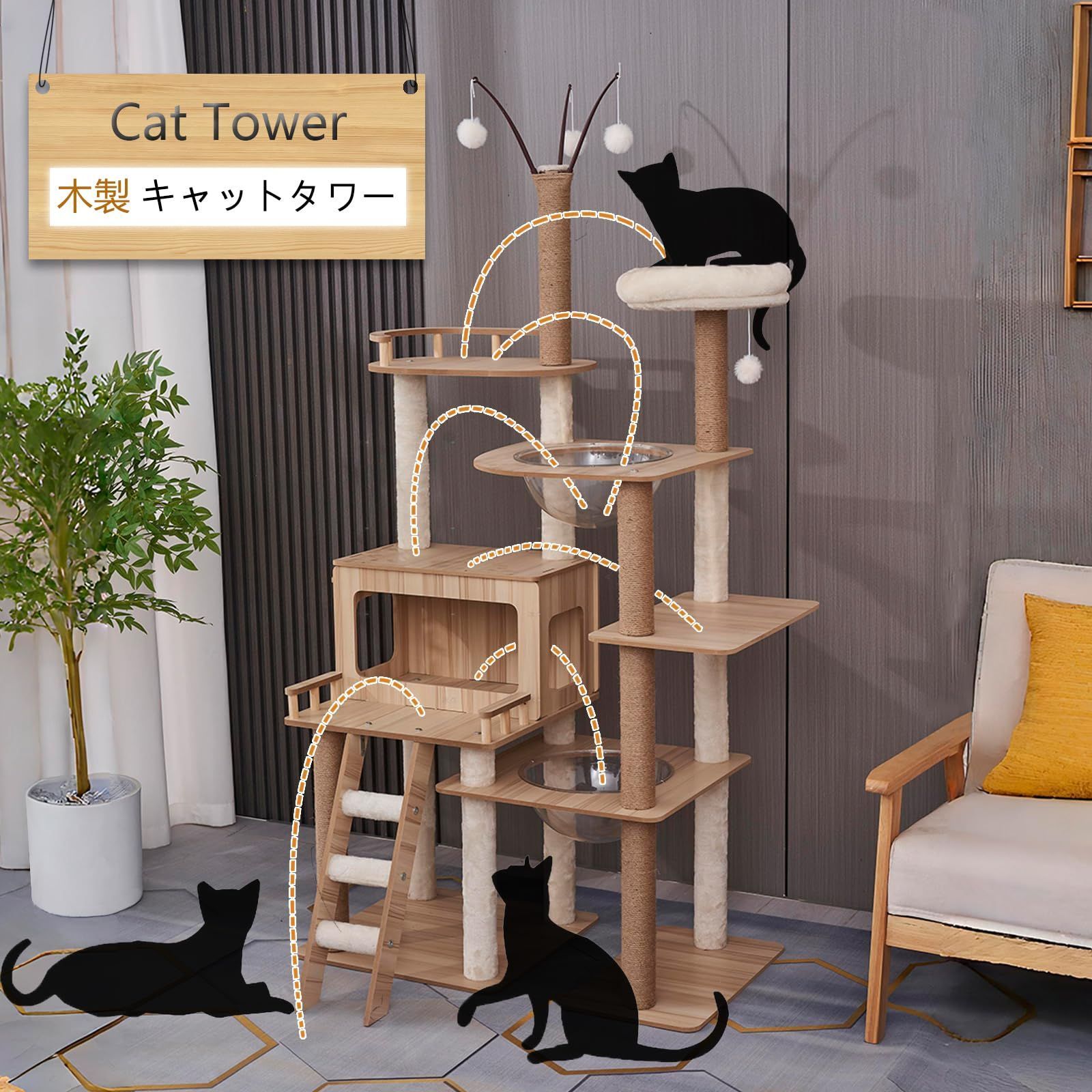 キャットタワー 木製 大型猫用 猫タワー 据え置き型 - 多頭飼い 付随 宇宙船 するねこハウス 運動不足解消 高い安定性 お手入れ簡単 老猫用 短足用 高さ172cm