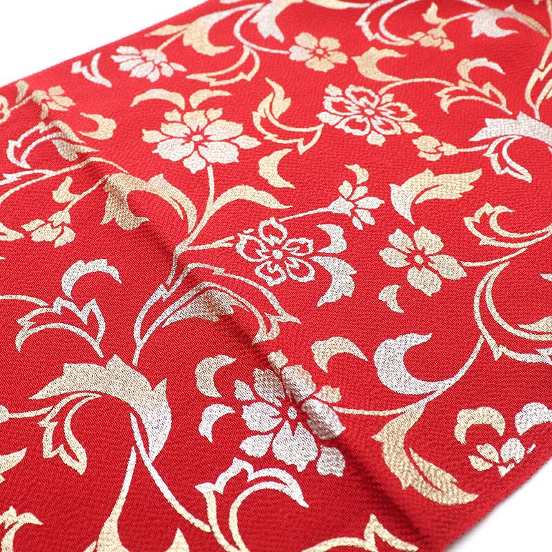 帯揚げ 振袖用 正絹 縮緬 成人式 晴れ着 赤 花唐草 煌びやか 長さ170 cm 幅28.5 着付け小物 和装小物 振袖小物
