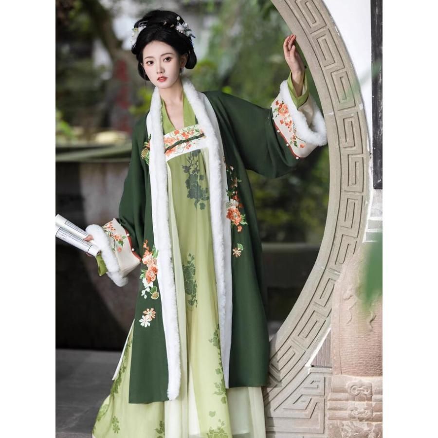 高品質 唐朝漢服 レディースマント 唐装漢服ワンピース 秋冬 漢服ファー付きマント 花柄刺繍 ロング丈ケープ 優雅なチャイナ服 コスプレ衣装