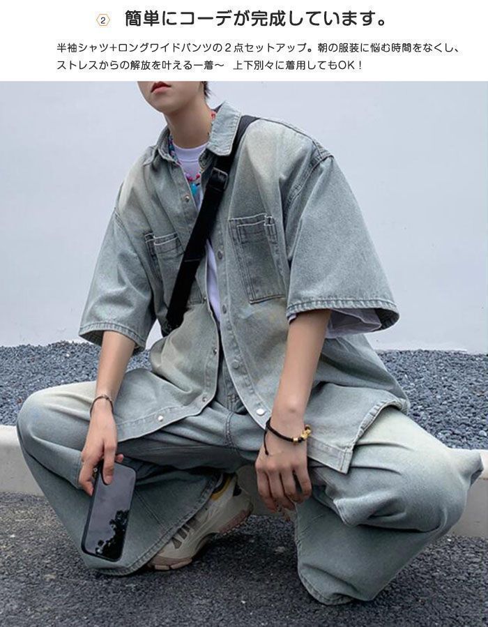 デニムセットアップ メンズ 夏 半袖シャツ ロングパンツ ワイドパンツ デニムパンツ 半袖ブラウス ボタンつき 上下セット 薄手 ゆったり おしゃれ ファッション ボトムス 柔らか 2点セット 夏服 男性用 高級感 夏祭り レゼント ギフト