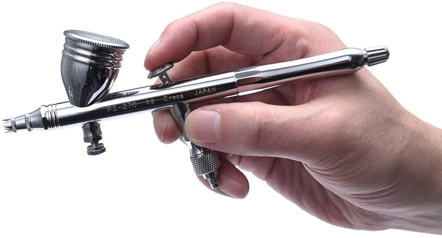 0.2mmのノズル口径に、セミイージーソフトボタン、エアアジャストシステム、さらにエア圧を安定させるエアアップ機構を搭載した究極の精密塗装用エアブラシです。10ccカップ付き。 【プラチナタイプに搭載の優れた機構】 ・セミイージーソフトボタン: 吹き始めの塗料の噴き出しをスムースに促がします。エアブラシ内にたまった空気を調整することで塗料の吹き始めにおこりがちな、つぶ状の塗料が出にくくなります。 ・エアアジャストシステム: 0~最大まで、エア風量の調整が手元で可能になります。塗装中の微調整に役立ちます。 ・エアアップ機構: 低圧のエアーでも安定した作業がおこなえるようにエアブラシ内に独自のチュ-ニングをしています。 【ダブルアクションとは】 ボタンを押すことによりエアーが出、後ろに引くことにより塗料が出始めます。作業中でも自由に塗料量をコントロールできるため、幅広い表現が可能です。ニードルストッパーの設定により、一定位置以上にニードルが後退しないようにできるため、シングルアクションのような使い方もできます。いろいろな場面に対応できるため種類も多く発売されており、エアブラシの主流となっています。 (より)