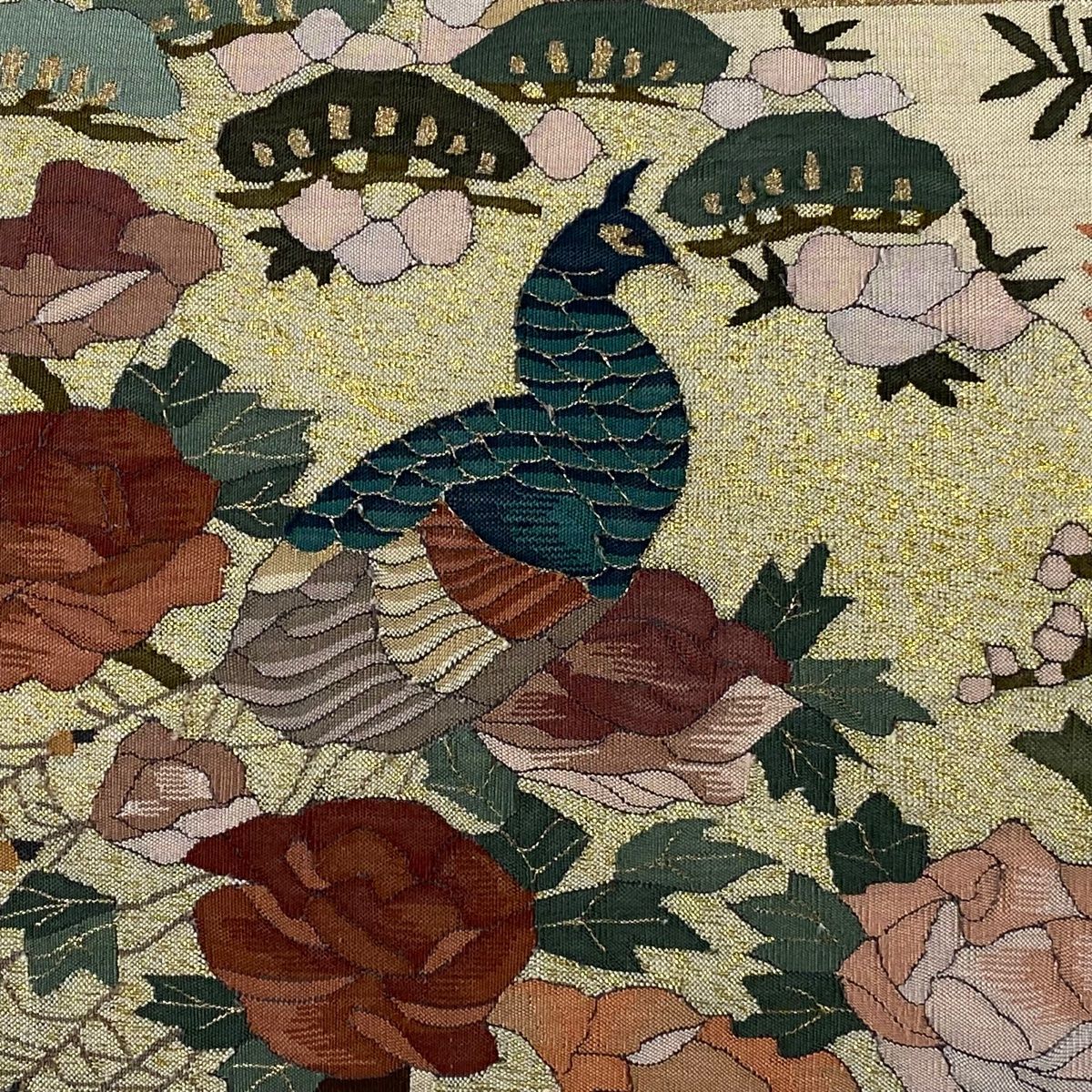 袋帯 孔雀 草花 箔 ベージュ お太鼓柄 正絹