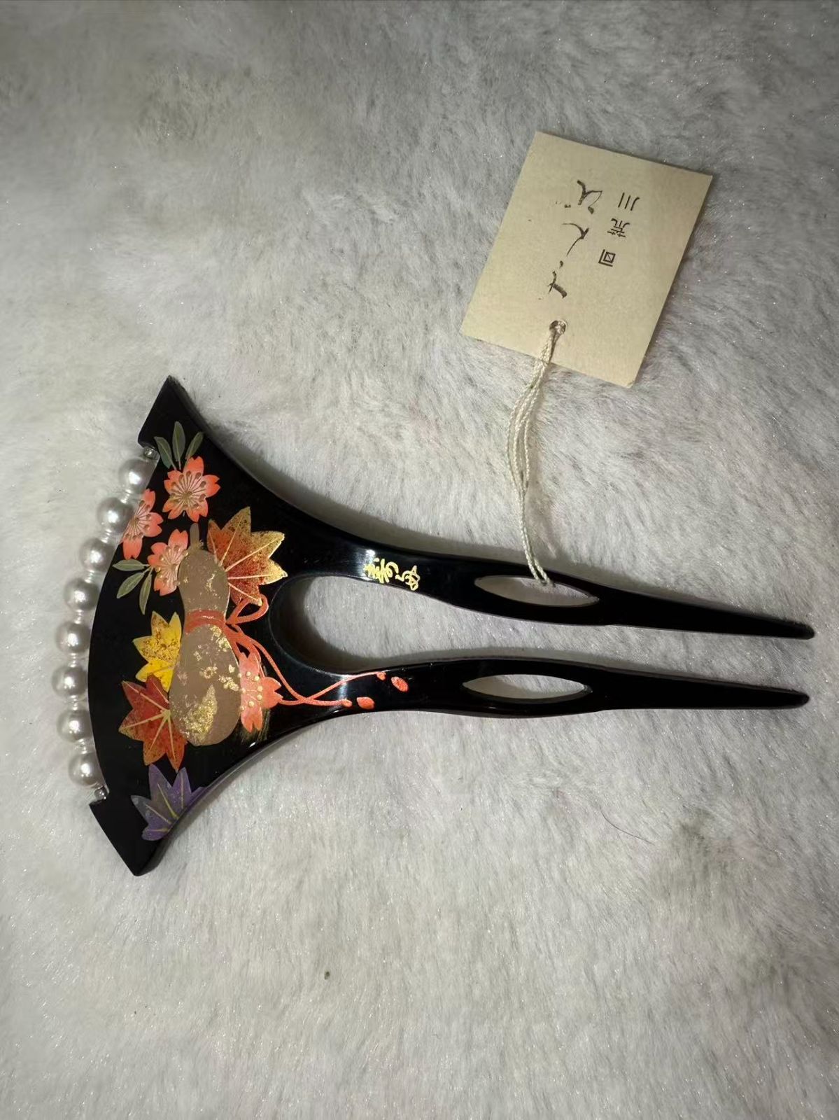 和装髪飾り 3点セット 人工真珠 扇形簪 紅葉 藤 蒔絵風