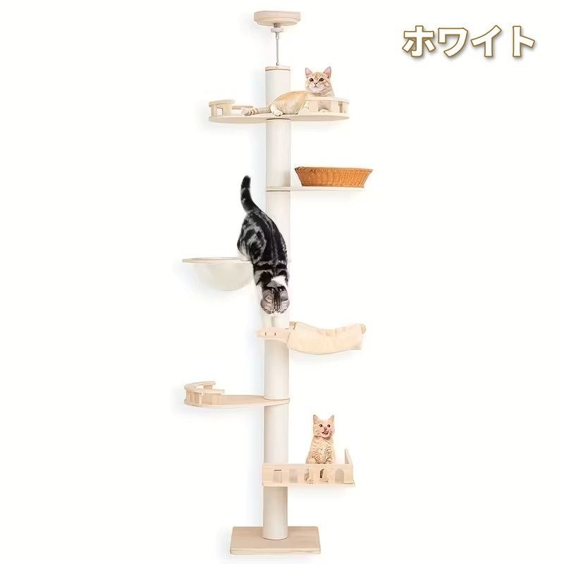 キャットタワー 猫タワー 大型猫用 突っ張り式 ハンモック付き シンプル おしゃれ インテリア 北欧 多頭飼い 展望台 宇宙船 爪とぎ 運動不足解消 安定 調節 スリム ホワイト ブラウン ラバーウッド コットン紐 天然麻紐 高さ213~272 cm
