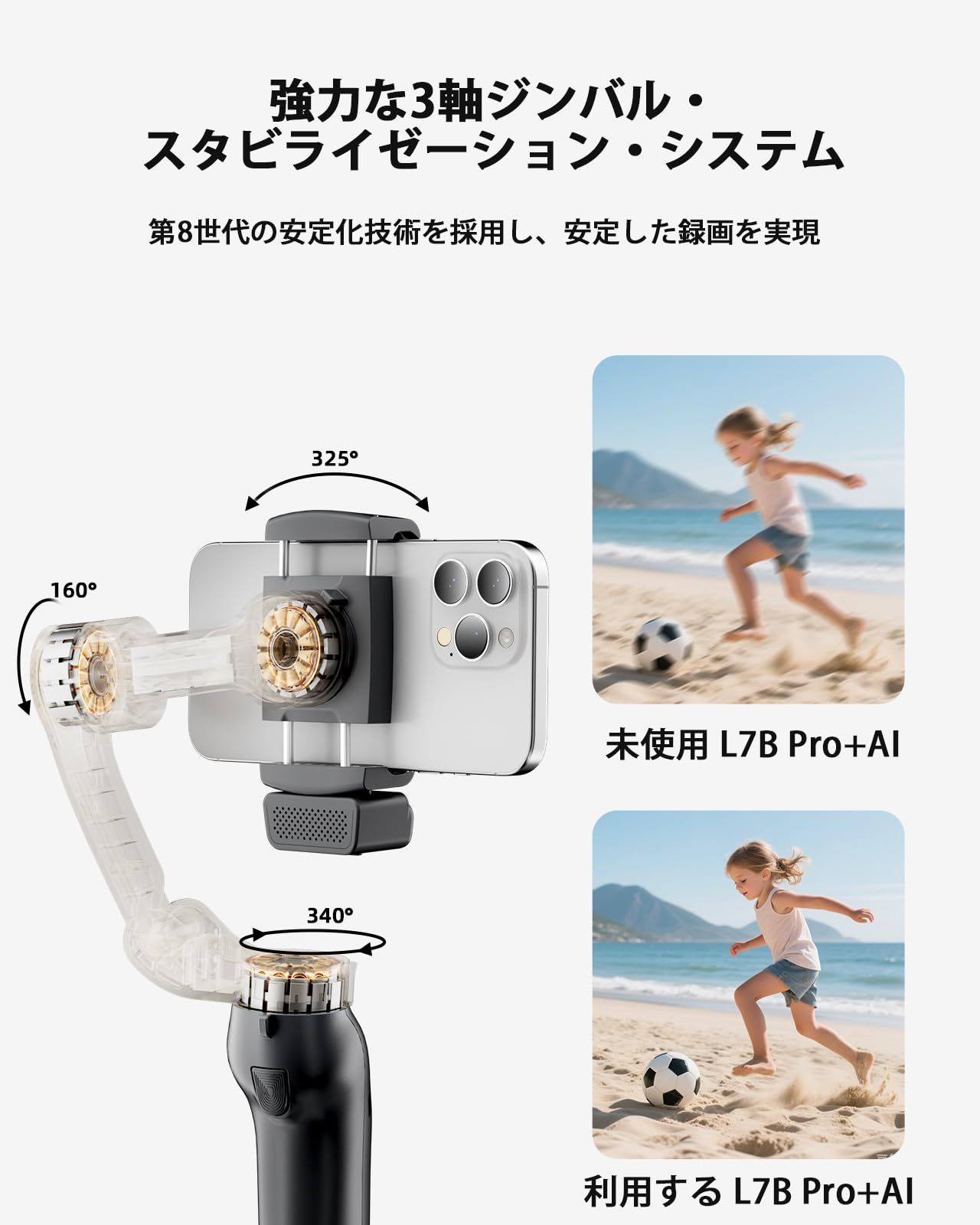 ジンバル 3軸 L 7 B Pro Max スマホジンバル AI自動追跡 ジェスチャー撮影 3階段調光ライト-美顔外部三脚付折りたたみ式 Android&iPhone用 スタビライザー収納ボックス付き日本語対応アプリ ブラック
