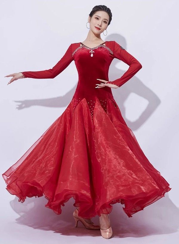 社交ダンスドレス 社交ダンス モダンドレス 大きいサイズ 長袖 広がる裾 スタンダードドレス ワルツダンス ワンピースドレス ダンス衣装 ダンスウェア ステージ衣装 競技会 カラオケ デモ パーティー 発表会 競技着 練習着 舞台 演奏会 演出 黒 赤S1M3