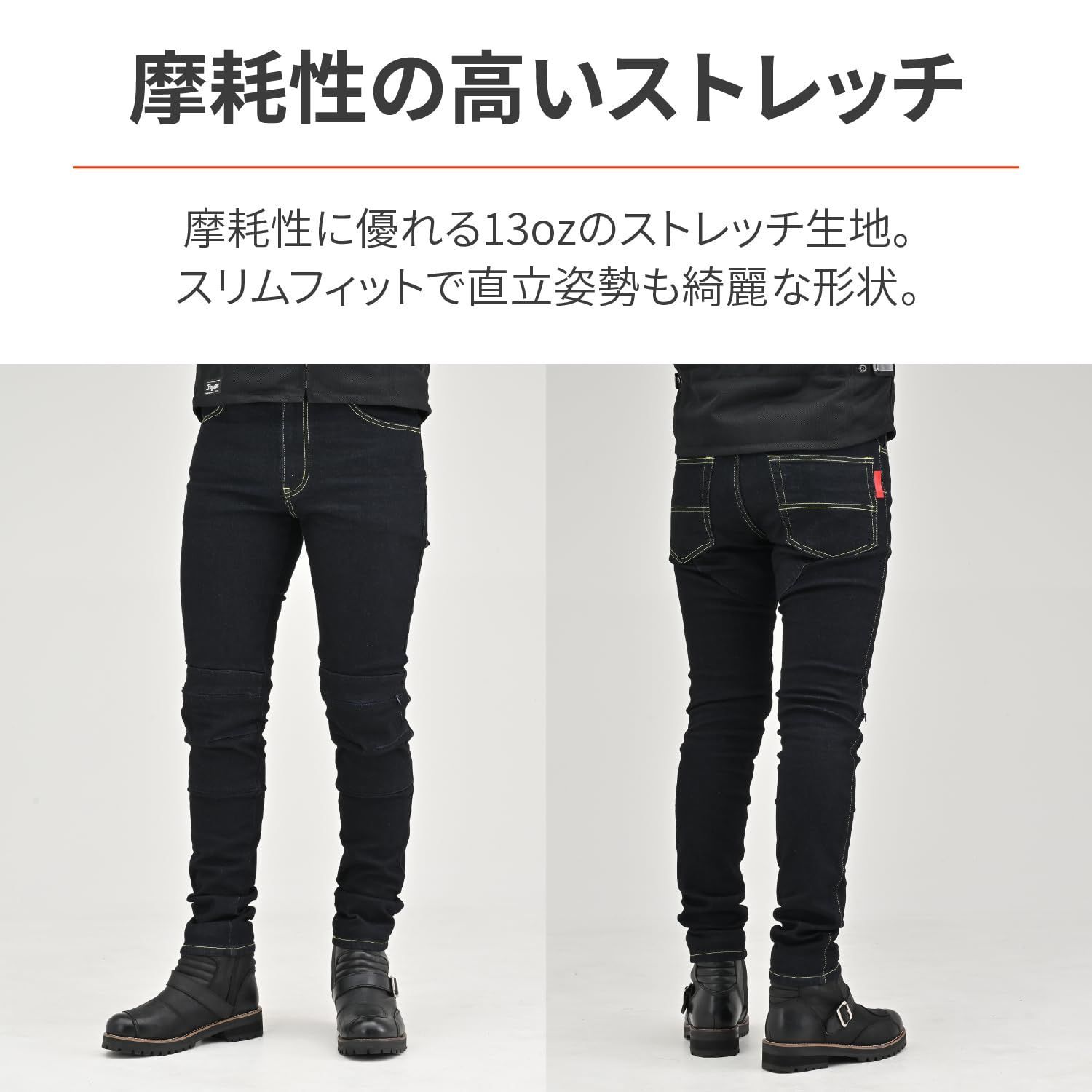 伸縮性に優れた13ozのストレッチ生地を採用し、動きやすさと快適さを重視