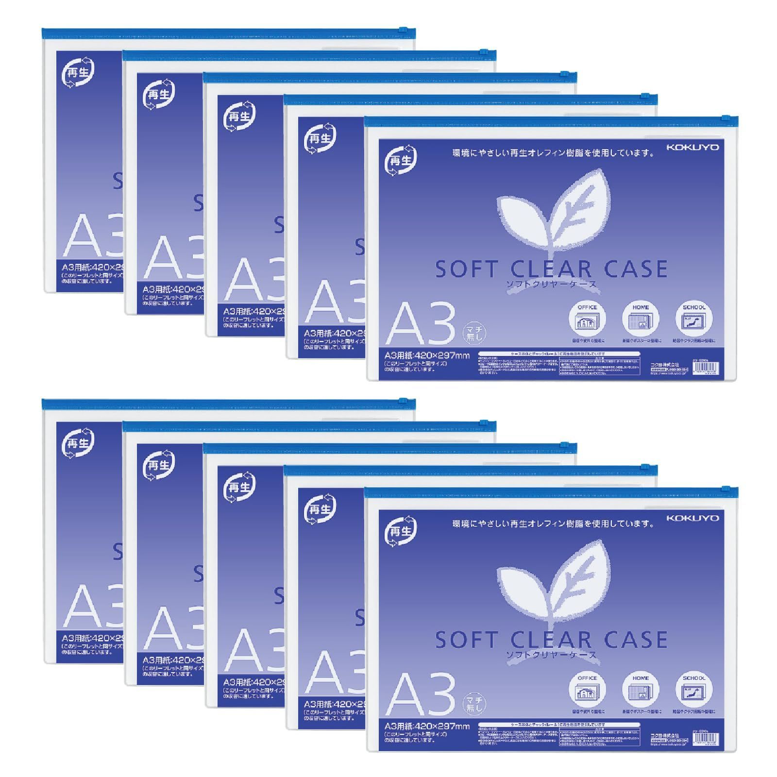 コクヨ ソフトクリヤーケース チャック付き マチなし 軟質 A3 青 10枚セット クケ-6313BX10