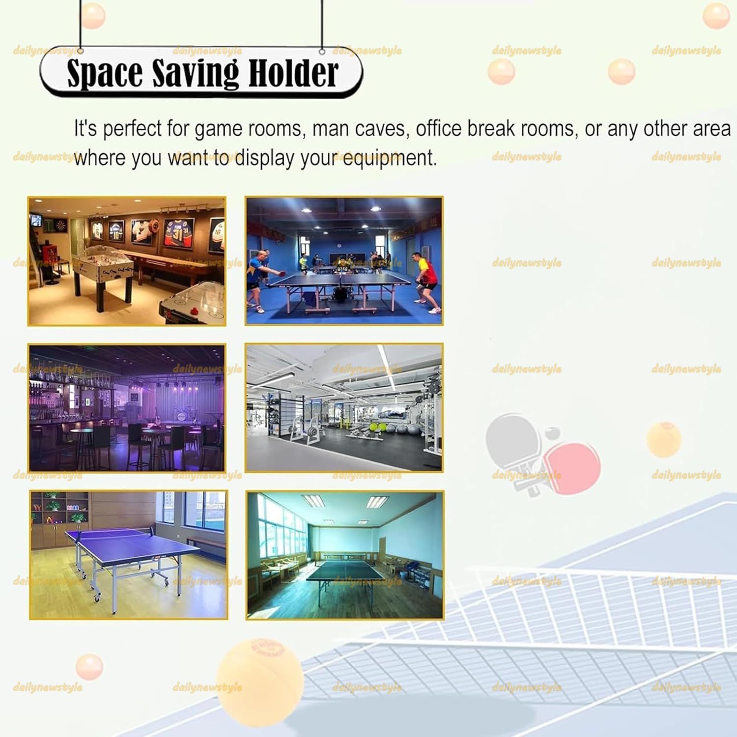 卓球アクセサリーの保管とディスプレイに実用的なソリューションで、ラケットを簡単に手に取ってプレイを開始できます。