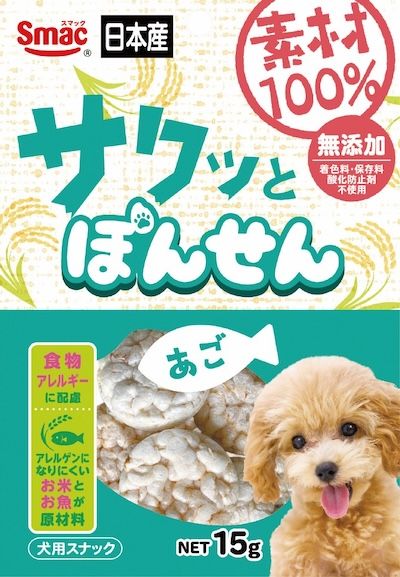 一枚一枚丁寧に手焼きで仕上げたサクサク食感の愛犬用おやつです。日本産のお米とあごのみを使用し、食物アレルギーに配慮しています。大切な愛犬のために、全て人間用(ヒューマングレード)の原材料を使用しています。