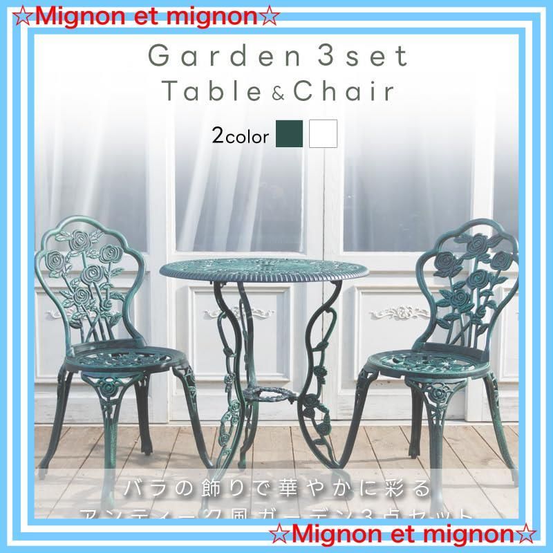 ローズアルミガーデンテーブル-チェア 3点セット イングリッシュガーデン カフェ風 Out おしゃれ の飾り 軽くてサビづらいアルミ鋳物製 のあるパウダーコーティング パラソル用ホール 滑り止め付 リビングアウト Living グリーン