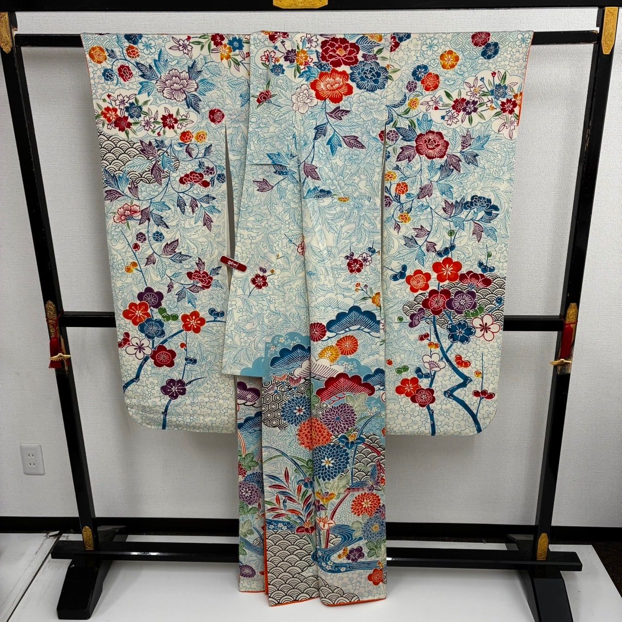 振袖 紅型 縮緬 蝶々 花柄 素敵なデザイン 正絹 着物 MK-028
