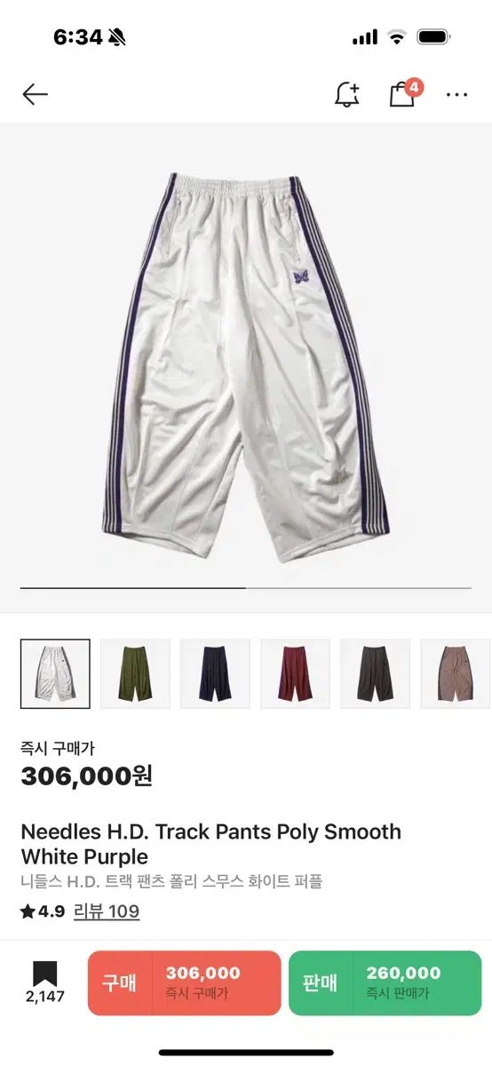 ニードルズ HD トラックパンツポリスムースアイスホワイトパープル