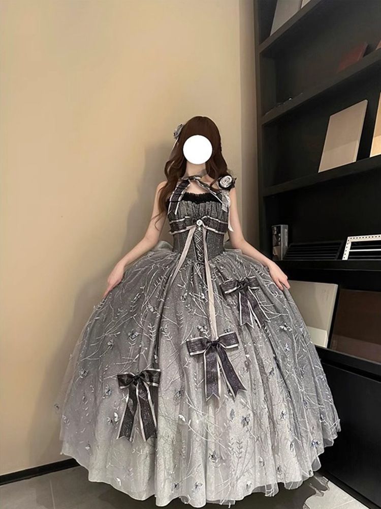 2025 水墨グレー 花嫁 ロリータ JSK ドレス 豪華ビジュー 刺繍 リボン付き ボリュームスカート プリンセスドレス 新年 撮影会 舞台衣装 フォーマル 結婚式 二次会 成人式