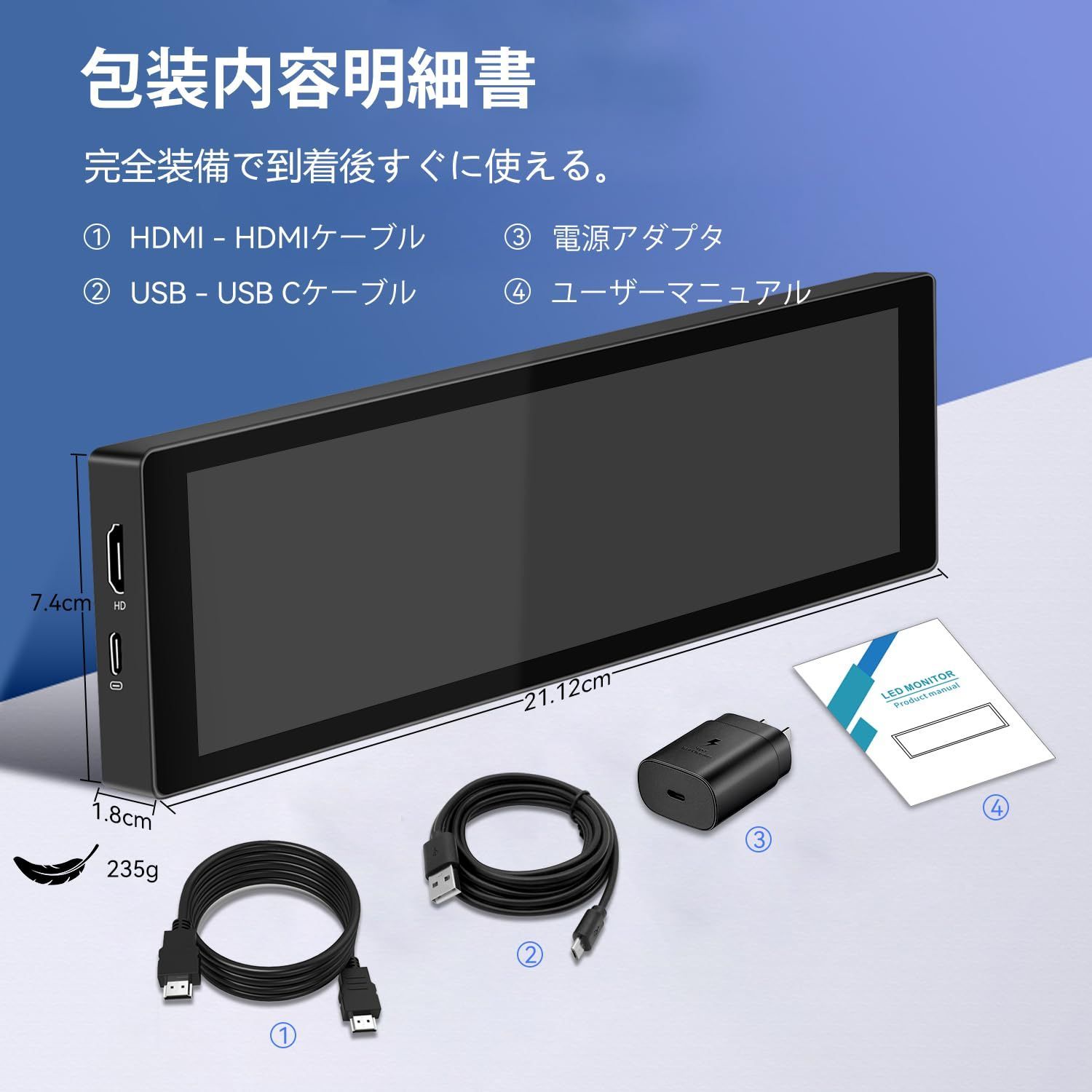 小型タッチパネルモバイルモニター7.8インチHD 1280x400PミニポータブルモニターAIDA64 PC CPU RAM のデータ モニターHDMI USBC IPSディスプレイ、輝度350cd/㎡、キックスタンド内蔵