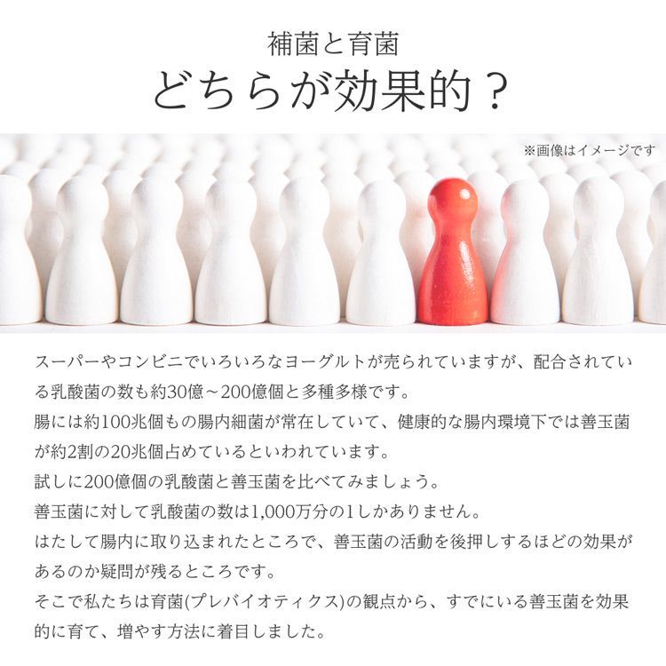そこで私たちは育菌(プレバイオティクス)の観点から、すでにいる善玉菌を効果的に育て、増やす方法に着目しました。