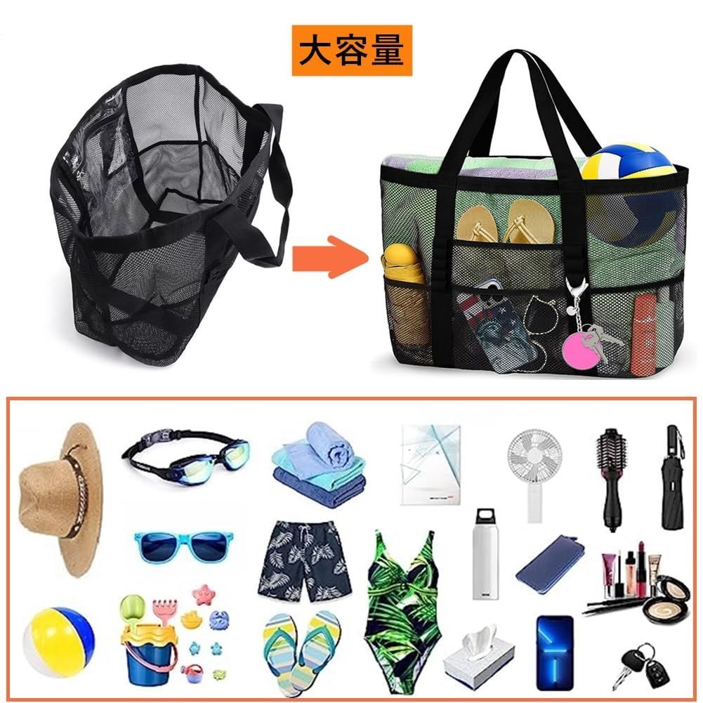 [BACISEN] プールバッグ 大容量 ビーチバッグ 大人 メッシュバッグ 丈夫 温泉バッグ 水泳バッグ 海用バッグ ポケット付き 折り畳み可能 男女兼用 旅行 銭湯 バッグ