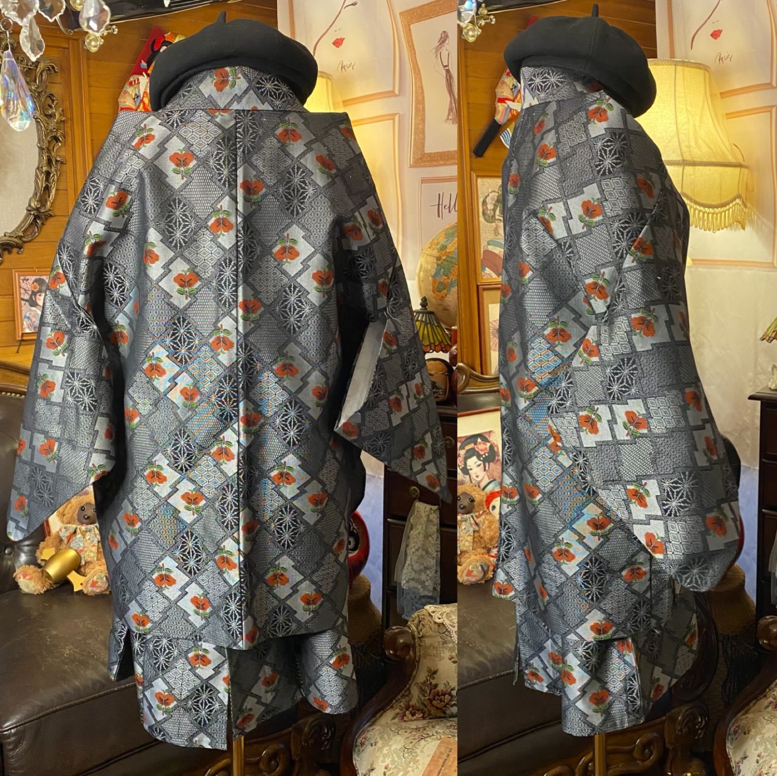 落ち着いた墨鼠〜チャコールを基調に、市松や麻の葉、小紋をモザイク調に配した総柄。ところどころに錆朱の花が咲き、レトロな艶感と温かみのある差し色が映えます。深紅×金の帯ベルトとゴールドタッセル紐でウエストマークすれば、式典や撮影にも映えるモダン和洋ミックスに。ベレーやブーツとも相性抜群—日常のレトロコーデから特別な一日まで品よく格上げしてくれる一着です