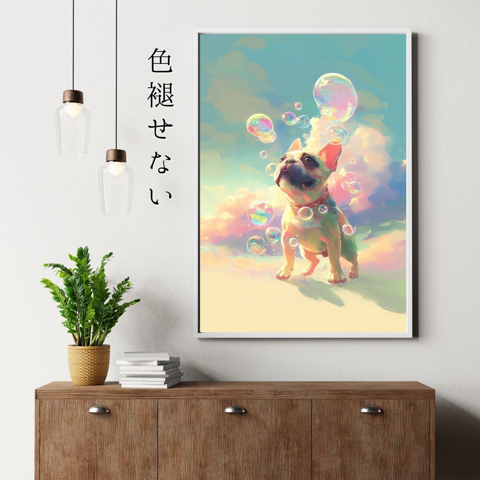 かわいいフレンチブルドッグ犬が、空に舞うシャボン玉を見つめる愛らしい瞬間を切り取ったアートポスターです。