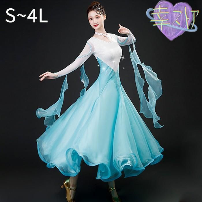 ※ご注意:詳しいサイズや注意点については、【商品情報?詳細】を必ずご確認ください。社交ダンスドレス 社交ダンス モダンドレス 大きいサイズ 長袖 大きい裾 スタンダードドレス ワルツダンス ワンピースドレス ダンス衣装 ダンスウェア ステージ衣装 競技会 パーティー 発表会 競技着 練習着 舞台 演奏会 演出 ホワイト ブルー
